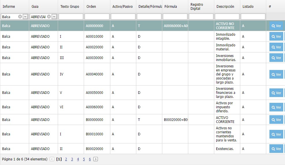 Las guías de balances son las plantillas con las cuentas, descripciones y fórmulas de cálculo con las que Marfil confecciona los informes financieros. Dentro del código de la aplicación no hay ningún número de cuenta, todos los informes se formulan desde esta opción.