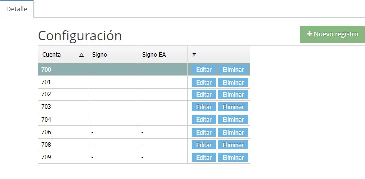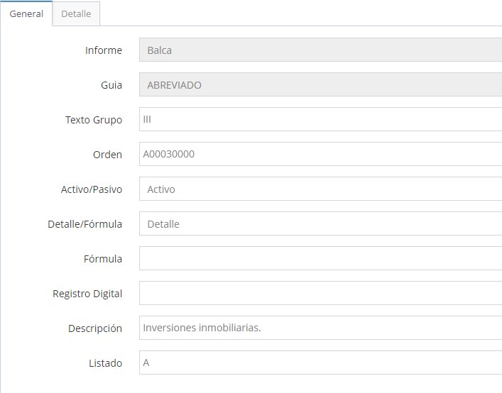 Detalle: en este tipo de registro se introducirán las cuentas contables que formulan el balance, los campos tipo detalle son los primeros que se evalúan.