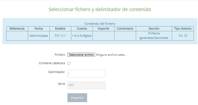 Es un proceso reservado al administrador del sistema para importar el diario contable de un ejercicio desde otro programa. El proceso se realiza mediante un fichero de texto en formato csv.
