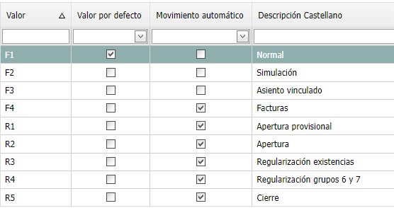 Tipo de asiento: Es un campo importante pues aquí distinguimos los asientos de Apertura R2, normales F1, regularización de grupos 6 y 7 R4 y cierre R5 de acuerdo a los valores indicados en la tabla varia 72.