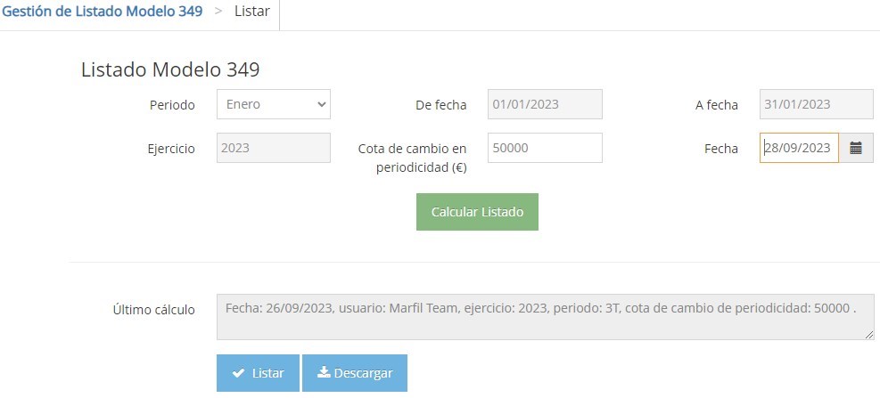 Advertimos de que el periodo indicado es el que se usa para calcular el informe, el que se va a «Listar» o «Descargar» es el último calculado y se muestra en el recuadro «Último cálculo»