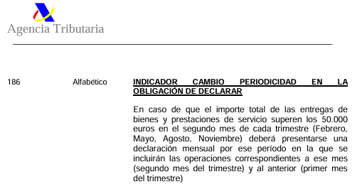 Cota de cambio en periodicidad, si se seleccionan los meses de Febrero, Mayo, Agosto o Noviembre, y el importe total de las operaciones sobrepasa una cota de 50.000,00 €, valor que se puede modificar en la pantalla de Marfil (cota de cambio de periodicidad); se debe listar también las operaciones del mes anterior al seleccionado, o sea: Enero, Abril, Julio u Octubre.