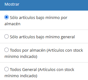 Sólo artículos bajo mínimos general. Mostrará los artículos que estén bajo mínimos en la configuración general del artículo (pestaña Stock) siempre y cuando en algún almacén haya bajado el stock de seguridad y éste almacén no se haya indicado en la pestaña almacenes. No tiene en cuenta los datos de los almacenes (pestaña almacenes). Para mostrarlo, lo mismo, irá a buscar al «Diario de roturas de stock».