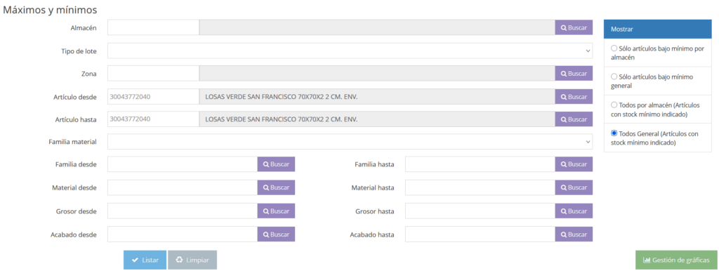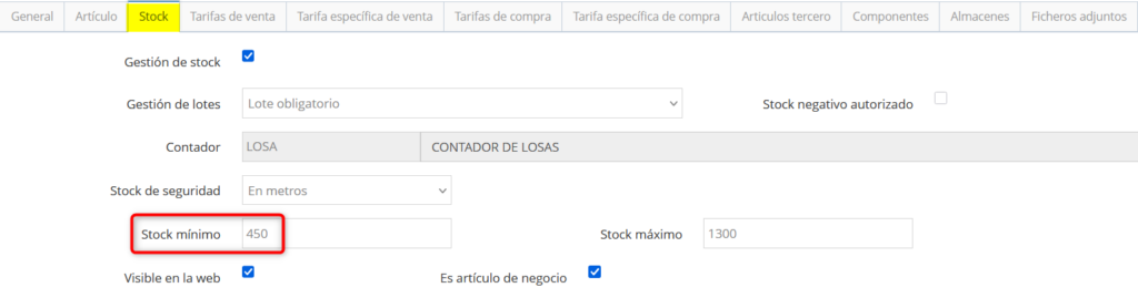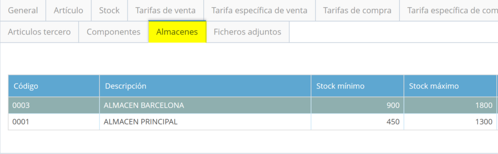 Ejemplo siguiendo las capturas anteriores, si el almacén 0001 no se le ha indicado en la pestaña almacenes, el artículo aparecerá en el listado porque en la pestaña general tiene un mínimo indicado.