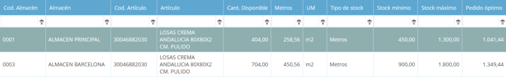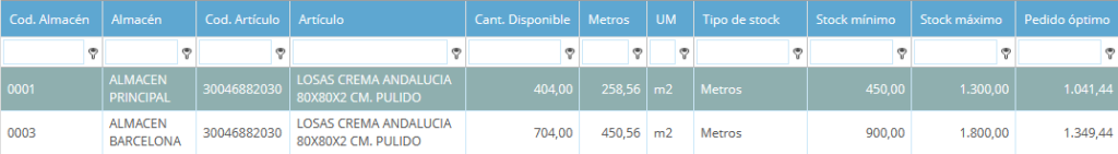 Cod. Almacén y Almacén –> muestra resultados de este artículo y lo separa por almacén, en el caso de que haya registros en varios almacenes.